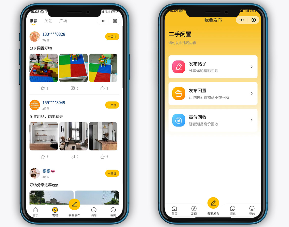 一款基于 Uniapp+FastAdmin+ThinkPHP 開發的二手物品交易APP系統,支持 APP+H5+小程序多端使用。賣家可以發布二手信息,買家可以在線詢價,支持在線聊天、在線購買支付、發布高價回收信息。同時,系統還帶有社交板塊,用戶可以發布帖子、加入圈子、關注好友。