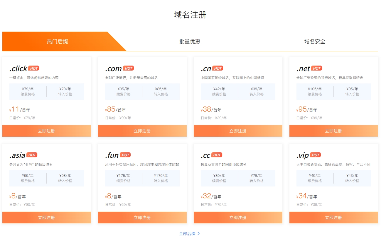 域名:日常一般選擇.cn/.com后綴的域名,價格從32-86元/年不等,有一些特殊域名比如:.click后綴域名,則首年只需要11元;